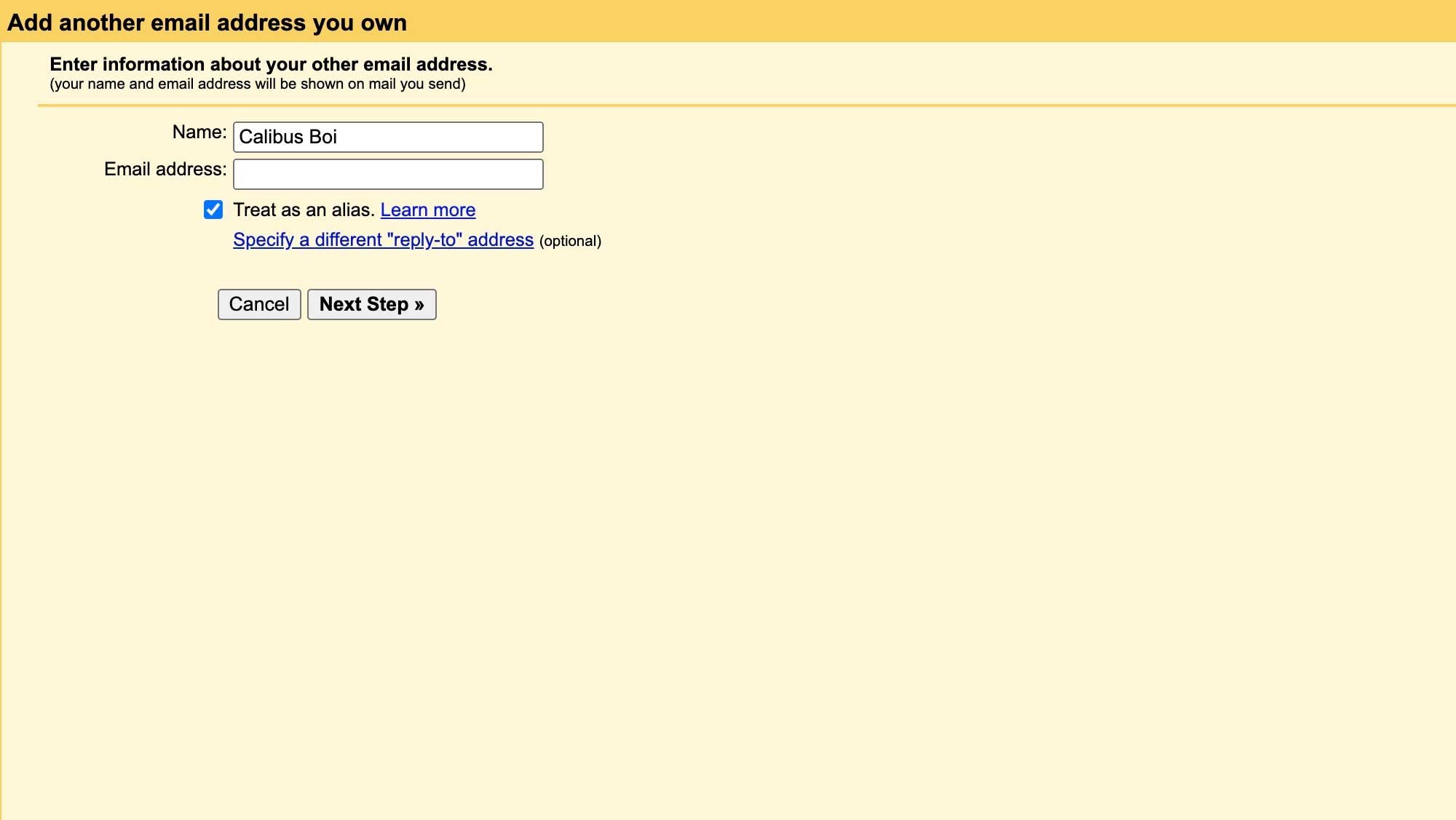 Provide your name as you want it to appear when sending emails and ensure the “Treat as an alias” checkbox is checked. Click “Next Step” to proceed.